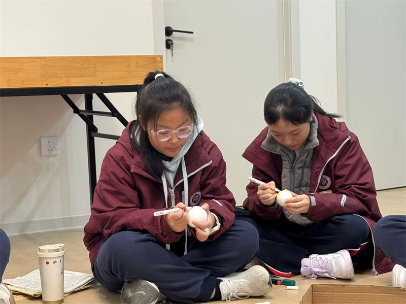 活动在轻松的氛围中展开。社员们首先在沙盘活动室开展“情绪谐音梗猜猜猜”环节。“香菇”(想哭)、“洗月”(喜悦)等趣味表达引发阵阵笑声,同学们的情绪在轻松互动中逐渐“松绑”。随后,在学校心理教师鲁帅的引导下,活动进入“情绪可视化”阶段。同学们以白色球体为“星球”,用水彩将当下的心情描绘其上。专注的绘制过程成为情绪梳理的窗口,无形的情感转化为一件件独特的“情绪星球”作品,实现无声的倾诉与整理。
