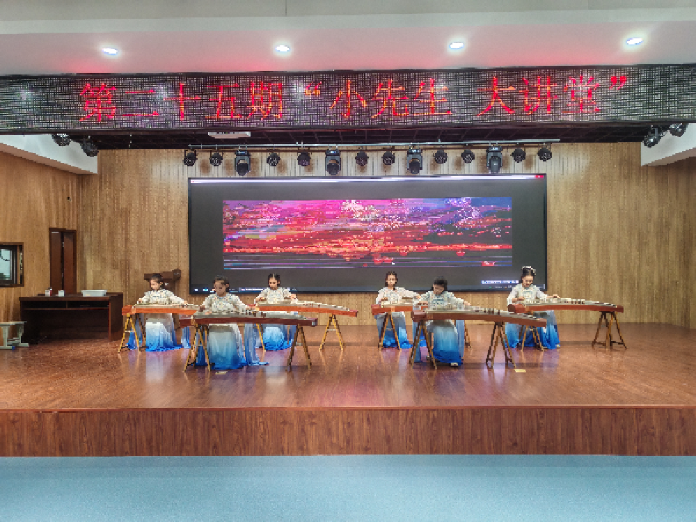 本期“小先生,大讲堂”节目形式丰富,衔接巧妙,既有传统经典的生动再现,亦有跨界创新的艺术表达。活动伊始,三年级同学的一曲古筝合奏,瞬间将观众带入一个悠远而宁静的意境。